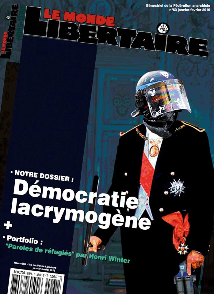 C’est le titre de mon entretien de 4 pages dans le nouveau numéro du Monde Libertaire hors-série (janvier-février 2016). Une très bonne cuvée, avec toutes sortes d’approches, que je viens de savourer et que je vous recommande. La couverture déménage : « Démocratie lacrymogène ». Le sommaire est pléthorique. Quant à mon entretien, il est pages 20 à 23, répondant à mon vieux compagnon Dominique Lestrat du groupe Kropotkine dans l’Aisne.