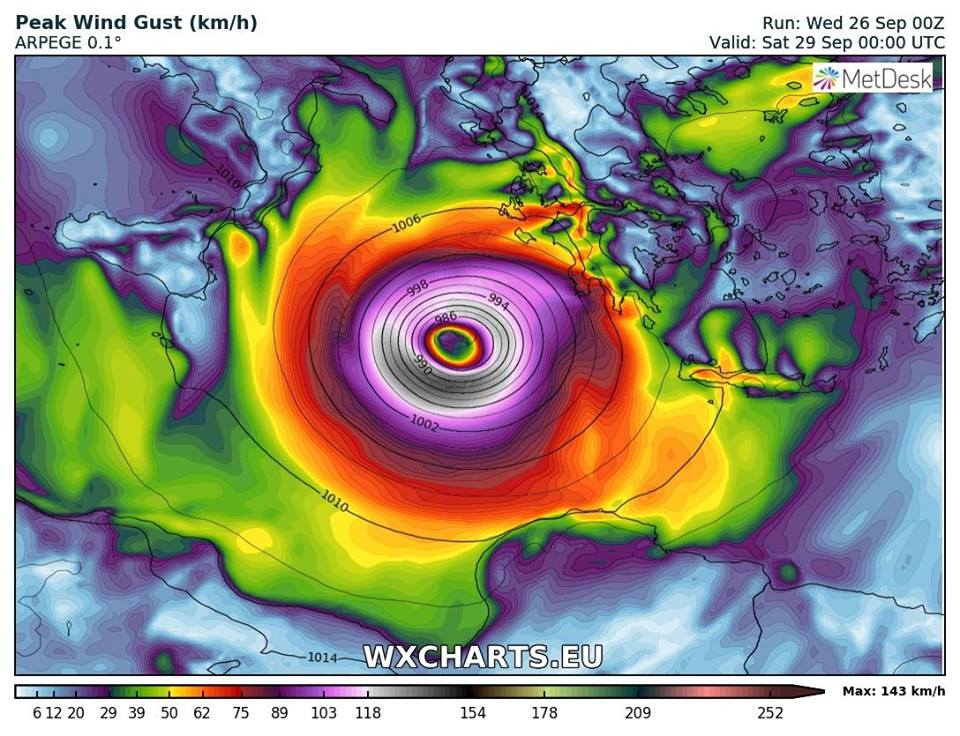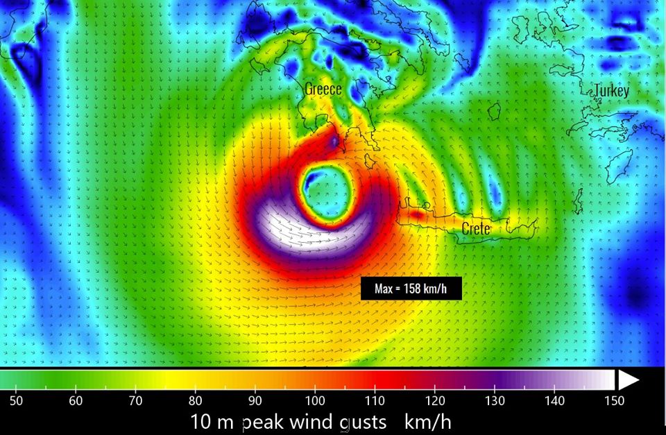 L’ouragan passera dans la journée de demain au large de Cythère et de la Laconie (Sparte), puis se dirigera ensuite vers Athènes dans la soirée, mais fortement affaibli, probablement sous forme de fortes pluies et de vents violents qui devraient également traverser les Cyclades d’ouest en est.