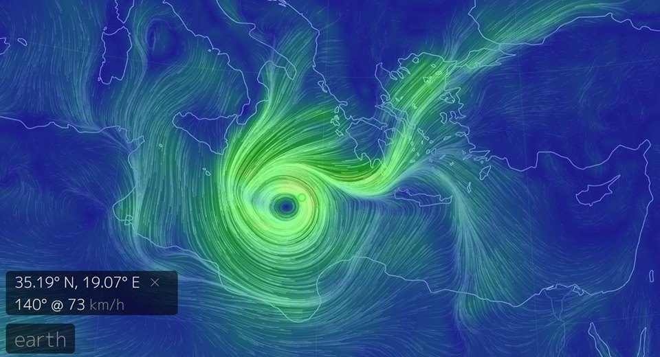 * Ce genre d’ouragan est localement appelé un « Medicane » : réduction de Mediterranea (Méditerranée) et de Hurricane (ouragan). Il a l’apparence d’un petit cyclone et peut faire beaucoup de dégâts, souvent mortels.
