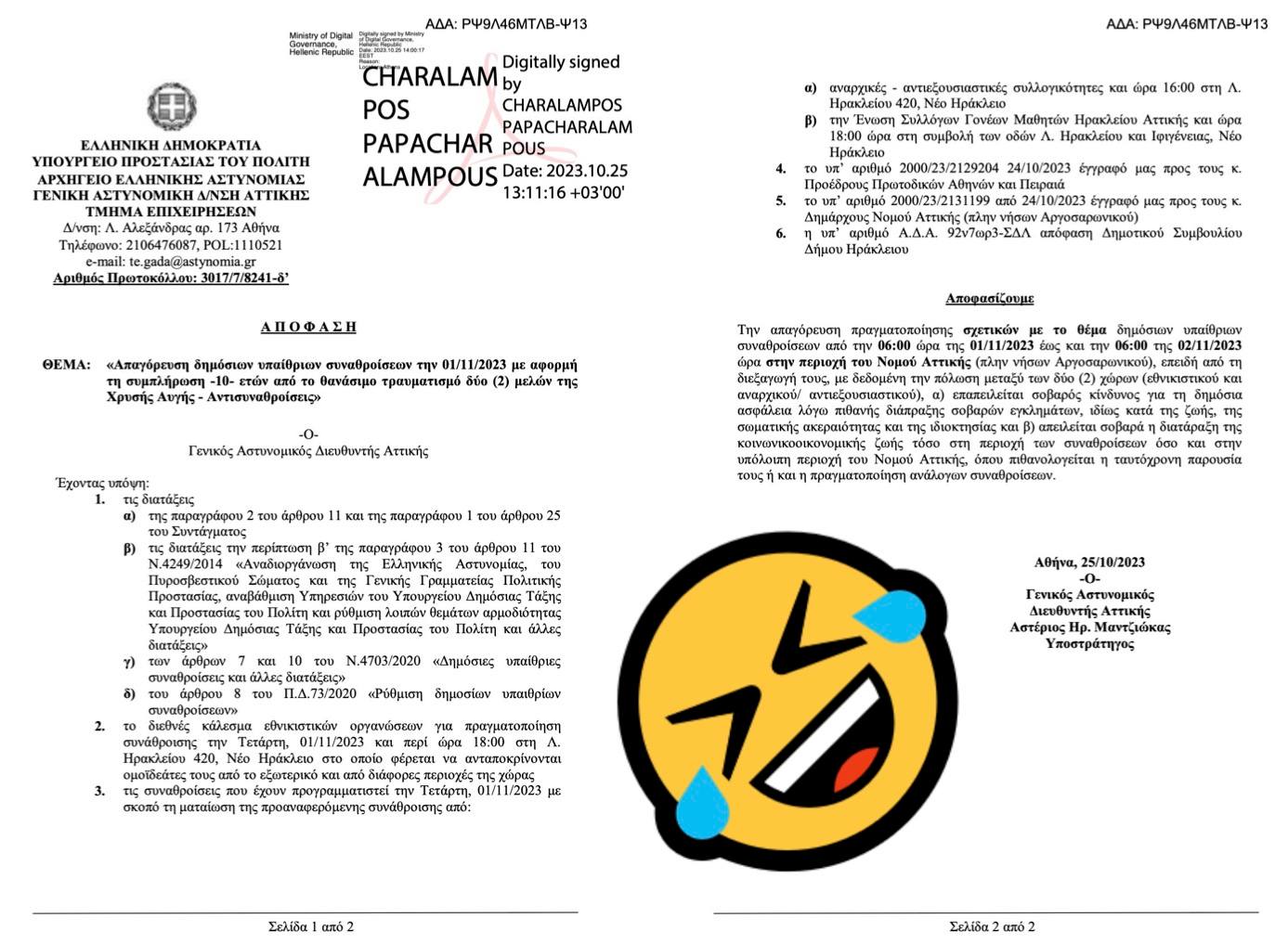 LA DIRECTION DE LA POLICE VIENT D’INTERDIRE TOUTES LES MANIFS FASCISTES ET ANTIFASCISTES LE PREMIER NOVEMBRE DANS TOUTE LA RÉGION D’ATHÈNES ! ![]()
