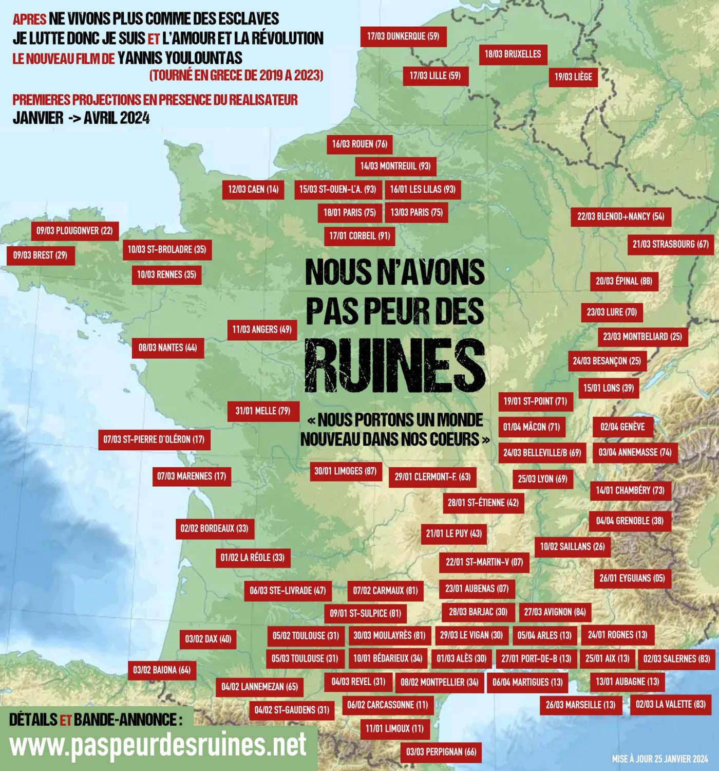 Parmi les nouveautés : Saillans le samedi 10 février, Perpignan le dimanche 3 mars, Rennes le dimanche 10 mars après-midi (finalement au cinéma Arvor) puis Ste-Broladre le soir, Lille le dimanche 17 mars après-midi puis Dunkerque le soir, Arles le vendredi 5 avril…