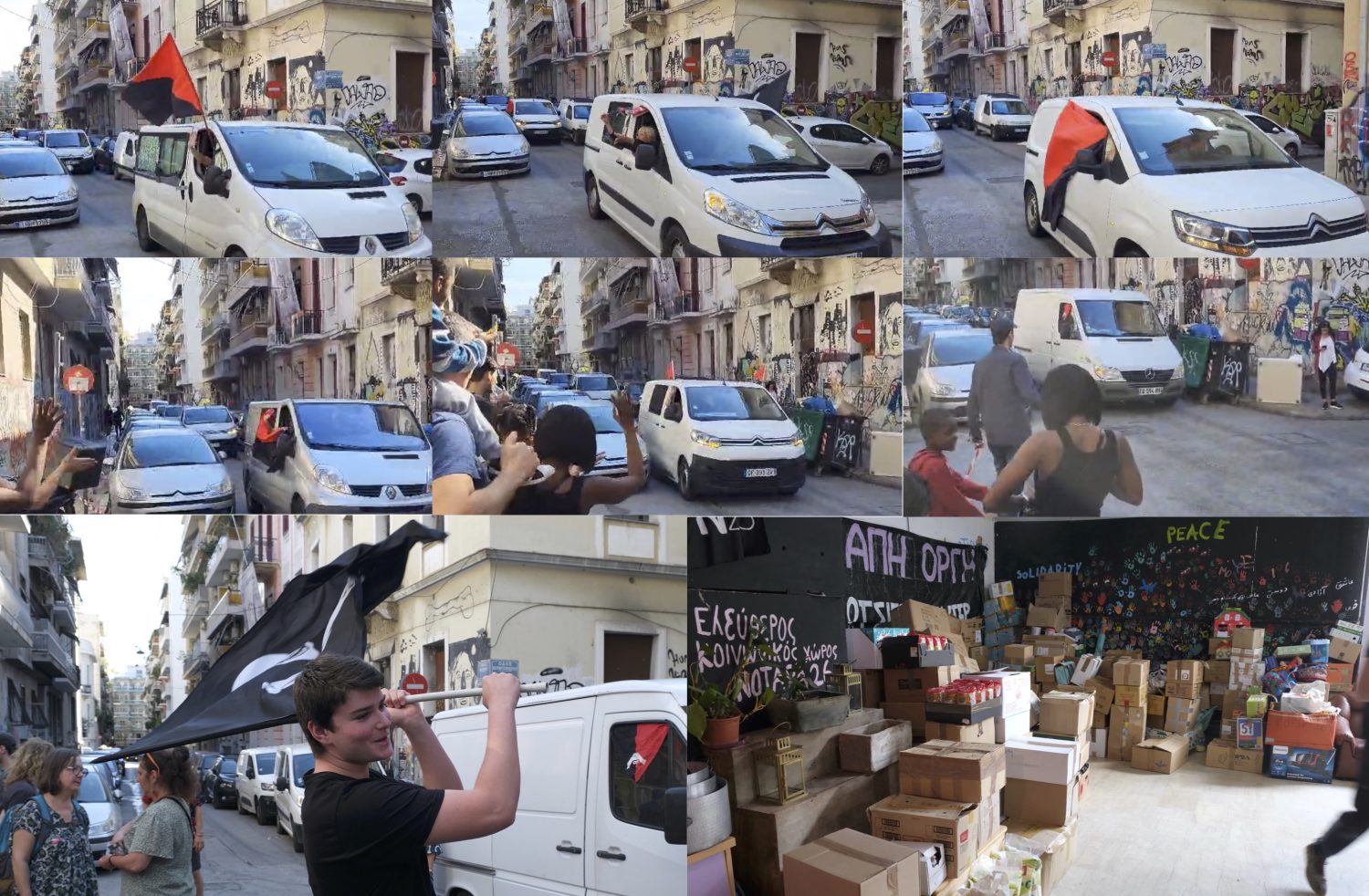 L’arrivée à Exarcheia des 8 fourgons du mois d’avril qui ont livré Athènes, puis Thessalonique, Ioannina, la Crète… 2 autres fourgons étaient venus en février et 4 autres fin mars pour une action de bricolage