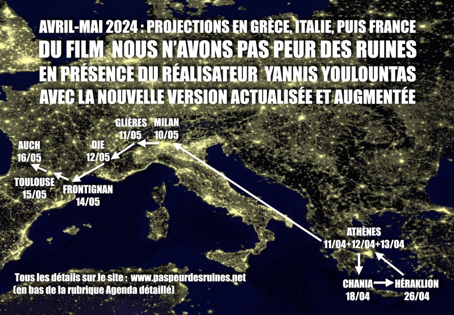 Ces jours-ci, « Nous n’avons pas peur des ruines » a reçu un superbe accueil dans plusieurs cinémas et lieux autogérés d’Athènes, ainsi qu’en Crète, à Héraklion et à Chania ! Durant l’été, nous serons en tournée en Allemagne avec Pia Klemp qui a définitivement gagné son procès en Italie, le 19 avril, avec les autres membres de l’équipage du Iuventa.