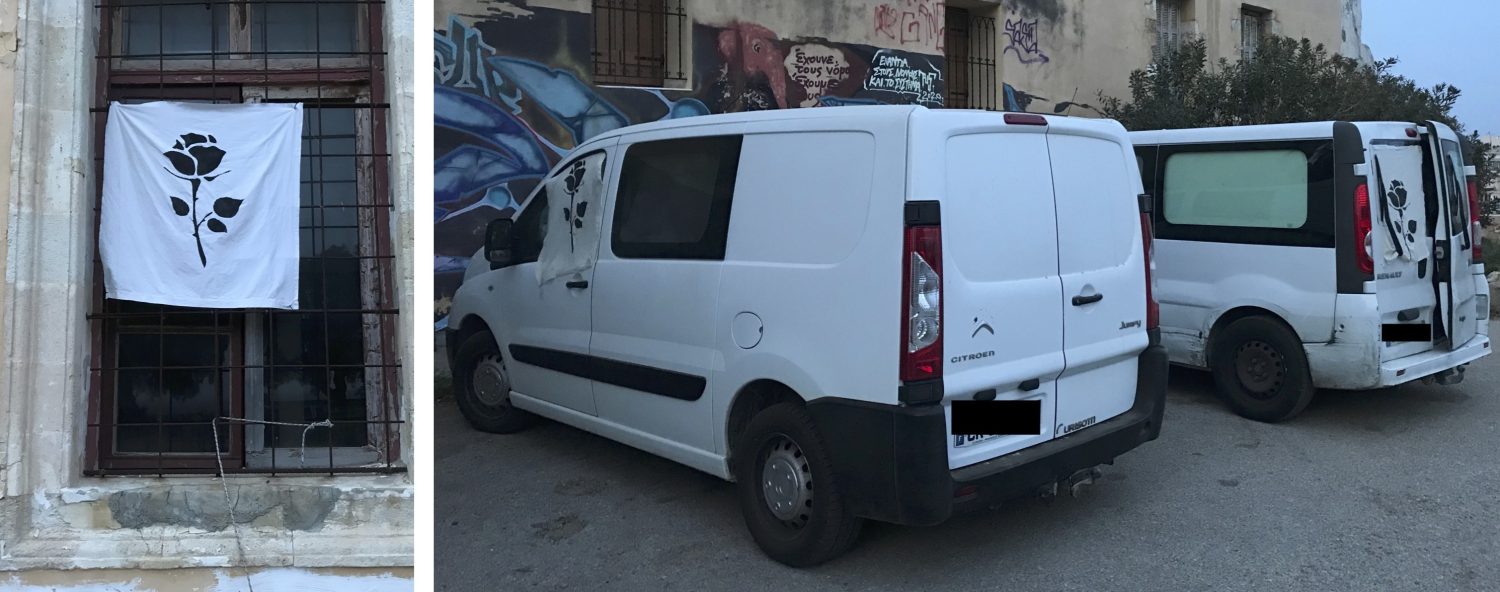 Un peu partout dans la deuxième ville de Crète, des bouts de tissus avec des roses noires pochées se sont répandues par centaines sur les fenêtres et sur certains véhicules (dont les nôtres), symbolisant la reprise du squat, envers et contre tout. Un grand moment, au bout d’une belle victoire !